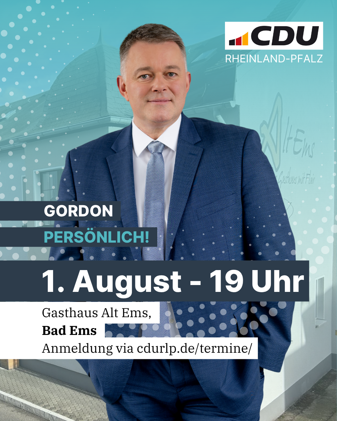 „Gordon persönlich": CDU-Spitzenkandidat Gordon Schnieder am 01. August 2025 um 19.00 Uhr zu Gast in Bad Ems.