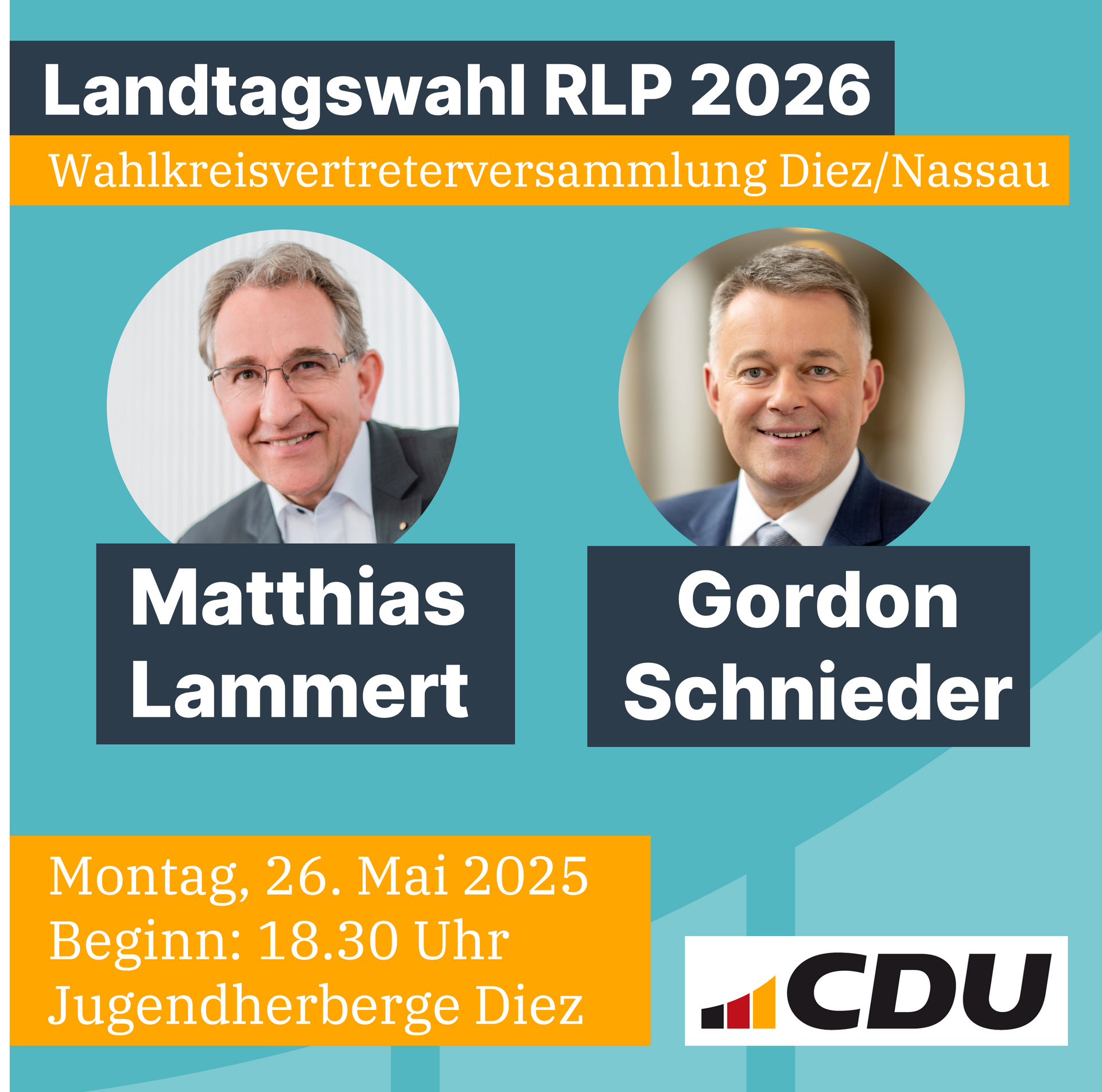 Diez. Die CDU Rhein-Lahn lädt am Montag, 26. Mai 2025, um 18:30 Uhr zur Wahlkreisvertreterversammlung in die Jugendherberge Diez, Schlossstraße 8, ein. Der CDU-Kreisvorsitzende Matthias Lammert MdL lädt herzlich zu dieser wichtigen Veranstaltung ein. Im Mittelpunkt der Versammlung steht die Aufstellung des CDU-Direktkandidaten sowie eines Ersatzkandidaten für die Landtagswahl 2026 im Wahlkreis Diez-Nassau. Nach den Vorstellungen der Kandidaten und Ersatzkandidaten folgen die formalen Wahlgänge. Stimmberechtigt sind 75 Delegierte aus den Gemeindeverbänden Diez, Aar-Einrich, Nastätten und Bad Ems-Nassau, die in geheimer Wahl über die personellen Weichenstellungen entscheiden. Zudem erwartet die Teilnehmerinnen und Teilnehmer ein hochkarätiger politischer Impuls: Gordon Schnieder MdL, Landesvorsitzender und Spitzenkandidat der CDU Rheinland-Pfalz, wird zu den Anwesenden sprechen und einen Ausblick auf die politische Ausrichtung der CDU im Hinblick auf die Landtagswahl geben.